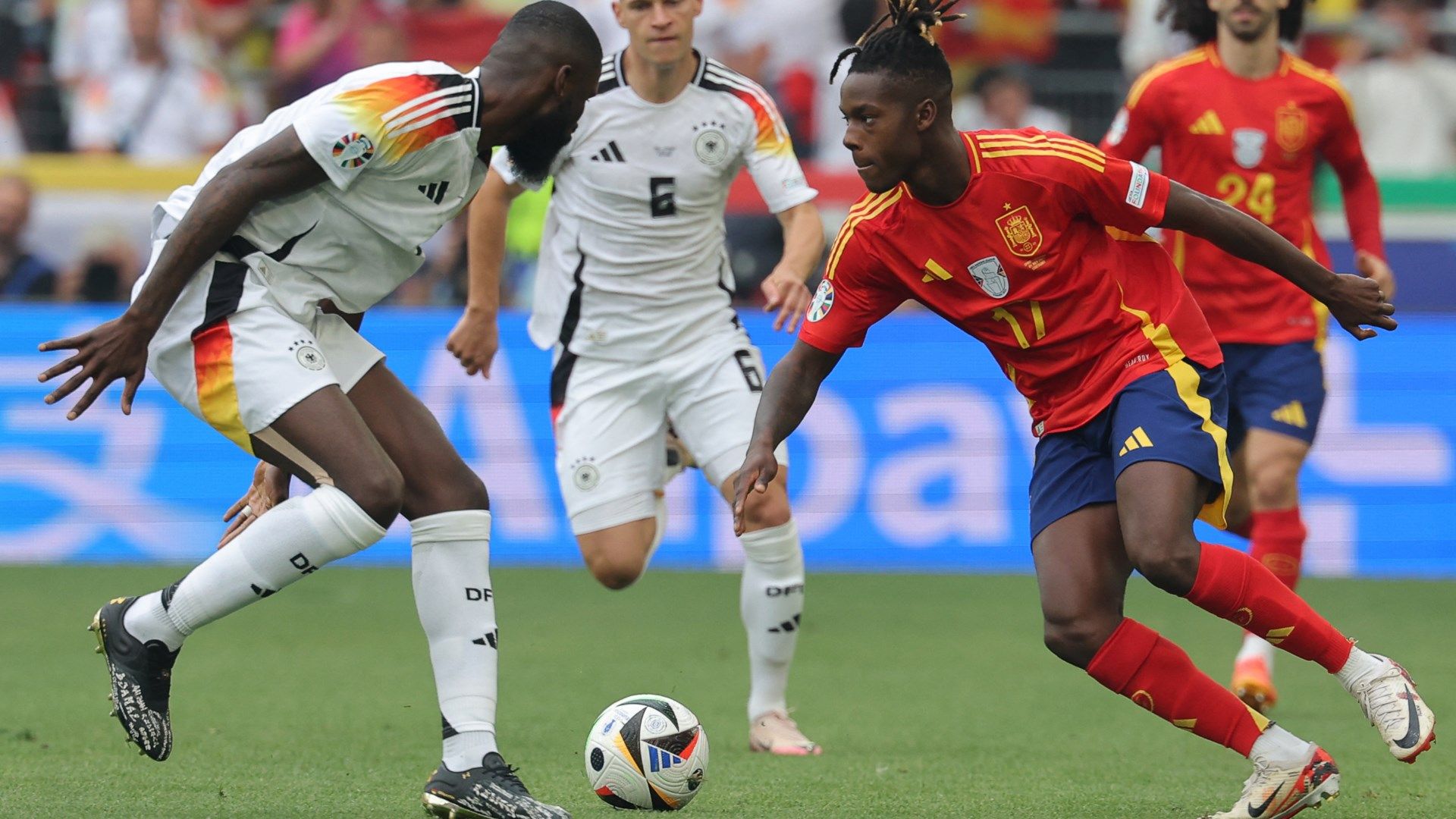 Solidų mačą sužaidė Vokietijos krašto gynėjas Joshua Kimmichas. Miuncheno „Bayern“ klubo futbolininkas puikiai pristabdė Ispanijos rinktinės „wingerį“ Nico Williamsą bei antro kėlinio pabaigoje atliko rezultatyvų perdavimą Florianui Wirtzui. Visų rungtynių metu buvo vienas aktyviausių Vokietijos futbolininkų, jungėsi į atakas, laimėjo penkias dvikovas iš aštuonių bei atliko 63 perdavimus, iš kurių 57 buvo tikslūs (90% tikslumas).